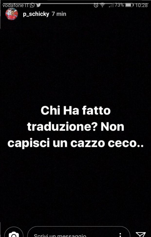 "Chi ha fatto la traduzione? Non capisci un c... di ceco". Patrik Schick non ci sta. Nella tarda serata di ieri sono uscite alcune dichiarazioni dell'attaccante della Roma rilasciate settimane fa sulle pagine del magazine ceco Reporter. Oggi sui social giallorossi è già scattata la polemica per questa frase riportata: "Spero di potermi trasferire tra qualche anno in un club ancora migliore, dove sarò ovviamente pagato ancora meglio, è una motivazione che mi ha sempre aiutato molto. Comunque non credo di poter andare molto più in alto di così. Ma forse restano un paio di club… Diciamo Real Madrid, Barcellona o Manchester United". Questa mattina la replica stizzita dello stesso Schick su Instagram Stories, cancellata poco dopo.