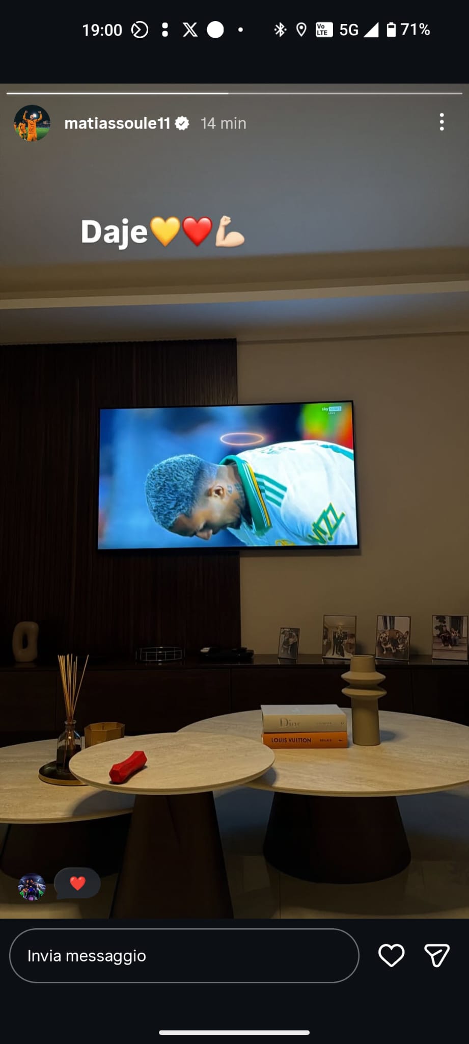 Tra i tanti tifosi che oggi seguono la Roma da casa c'è anche Mati Soulé. L'argentino non ha ancora recuperato dalla pubalgia che lo tormenta da settimane e non ha seguito la squadra a Bologna per l'andata degli ottavi di finale di Europa League. Gasperini spera di riavere Mati nella prossima gara di campionato contro il Como, in programma domenica alle 18. Nel frattempo l'ex Juventus sostiene i suoi compagni dal divano di casa. Il 18 giallorosso ha pubblicato su Instagram uno scatto che lo raffigura mentre segue la gara della sua Roma. "Daje" è l'incitamento da vero romanista che Mati ha scritto sui social.
