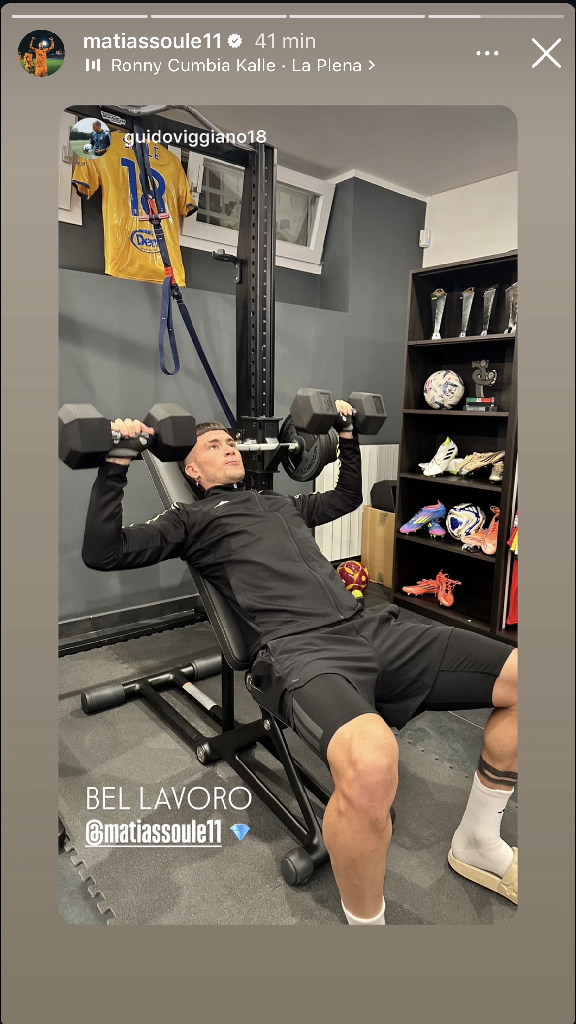 Meno di 3 giorni alla ripresa del campionato dopo la sosta per le nazionali. La Roma domenica alle 15 affronterà la Cremonese per confermarsi al primo posto in classifica. Uno dei protagonisti dell'inizio di stagione giallorosso è stato sicuramente Mati Soulé, autore di 3 gol e 2 assist. L'argentino è rimasto nella Capitale nell'ultima settimana, non convocato dalla Selecciòn e si prepara a fare di nuovo la differenza in Serie A. Per Gasperini la forma fisica è essenziale e l'ex Juve sta dimostrando di tenerci continuando ad allenarsi anche dopo la consueta seduta a Trigoria. Mati ha pubblicato un paio di stories su Instagram dove si allena con i pesi insieme al suo personal trainer. Non solo gambe, ma anche petto e braccia nella palestra di casa dell'argentino, ornata dai tanti premi MVP che ha conquistato in questi anni.