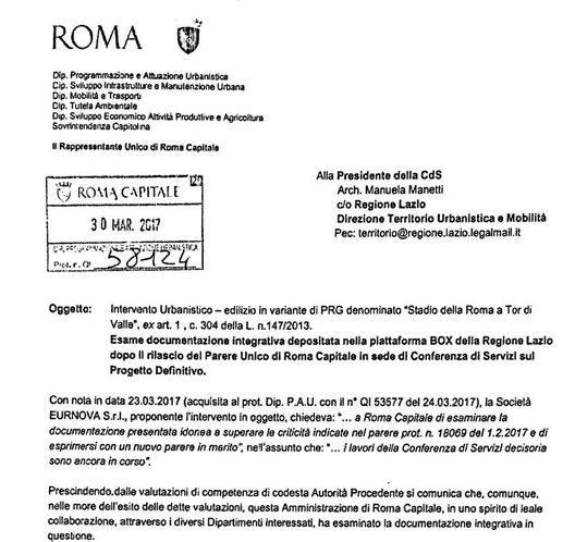 "Si dichiara che non si possono ritenere completamente soddisfatte le condizioni per superare il dissenso di cui al Parere Unico". Poche parole, ma pesanti. A scriverle è il rappresentante del Comune di Roma, Fabio Pacciani. Come si legge su iltempo.it, questa frase altro non significherebbe se non un'altra bocciatura al progetto dello Stadio della Roma. Un ennesimo parere negativo alla costruzione dell'impianto così come progettato. Bisogna integrarlo, ma a questo punto è difficile che la Conferenza dei servizi resti aperta. Il Campidoglio non sembra intenzionato ad approvare l'attuale e progetto e le probabilità che si debba intraprendere una nuova conferenza aumentano di giorno in giorno.