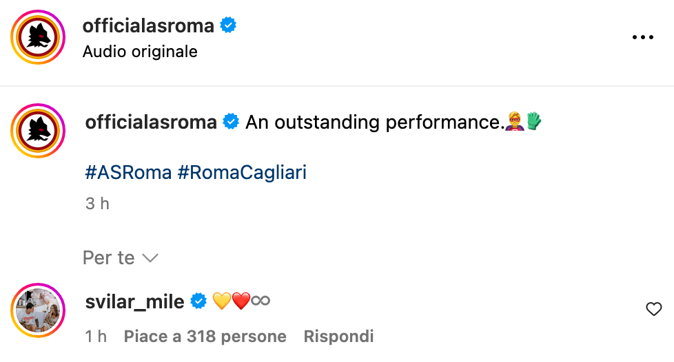 La Roma centra la sesta vittoria consecutiva in campionato, probabilmente la più sofferta in una giornata complicata che portava ancora le scorie di Bilbao. L'1-0 finale ha la firma di Dovbyk, ma soprattutto di Mile Svilar che è stato di gran lunga il migliore in campo, come testimoniano le pagelle e il premio della Lega Serie A. C'è però un tema legato al suo rinnovo, che Ranieri ha dribblato rimandando a Ghisolfi e che i tifosi aspettano di risolvere con ansia. Per questo il commento del portiere ex Benfica al post celebrativo delle sue parate da parte del club ha scatenato le speranze dei sostenitori romanisti. Svilar ha infatti postato i cuori giallorossi e soprattutto l'emoji dell'infinito.
