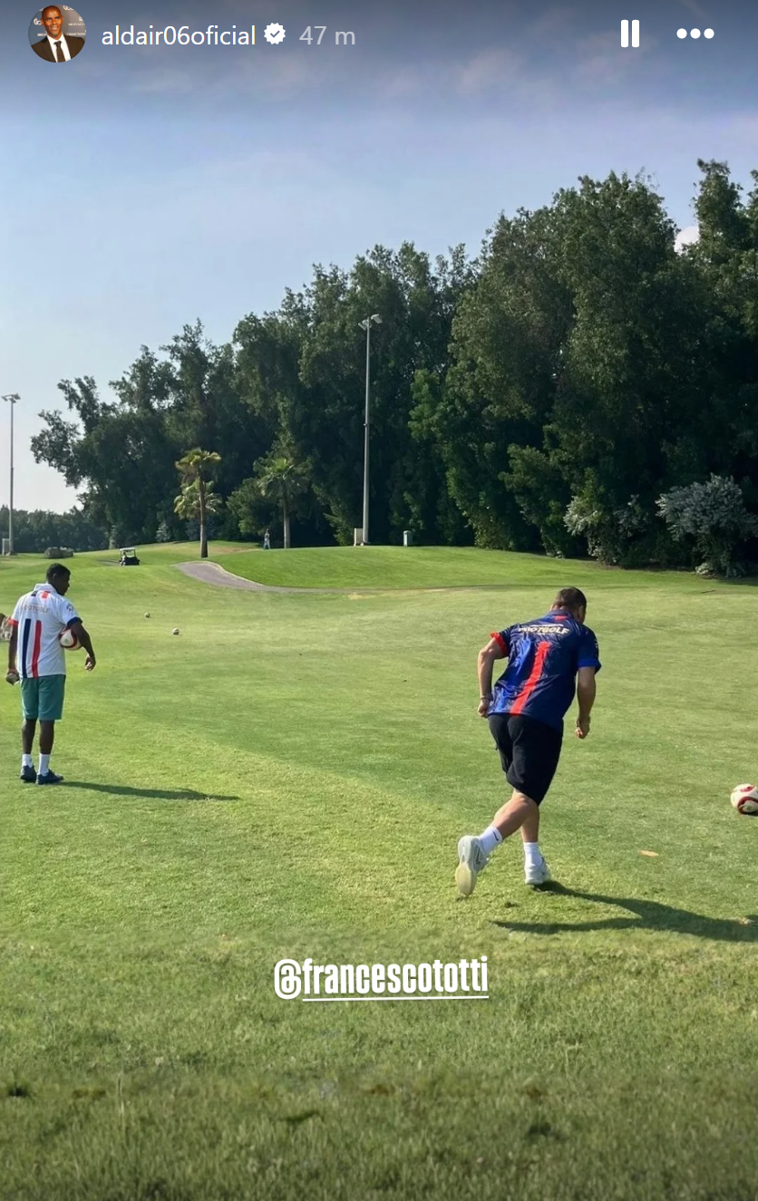 Francesco Totti e Aldair, un legame che va oltre la Roma e il simbolico passaggio di consegne della fascia di capitano datato ottobre 1998. I due, infatti, si sono ritrovati in queste ore su un campo da golf ma la passione per il calcio non è svanita, nonostante gli anni passino per tutti. Il brasiliano ha condiviso su Instagram uno scatto dell'ex numero 10 intento a calciare il pallone accompagnato dalla simpatica didascalia: "Chissà se il Capitano fa centro anche nella buca da golf. Con un pallone e Francesco, non si può mai sapere". E Totti ha risposto prontamente: "Con due colpi".