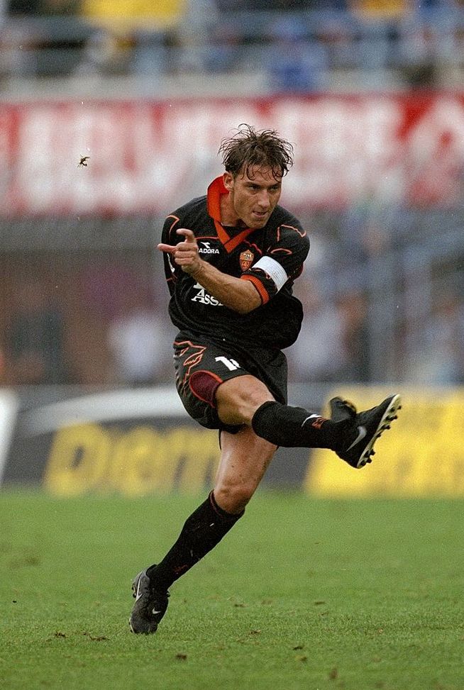 Passa una stagione e Francesco Totti, ormai capitano della Roma, indossa scarpini Nike Tiempo neri con baffo e suola bianchi. Semplicità e classe.