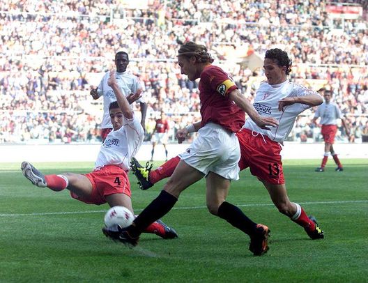 Ecco la stagione del terzo scudetto della Roma. Francesco Totti porta i giallorossi alla vittoria finale indossando ai piedi scarpini Nike neri con rifiniture rosse-aranciate.