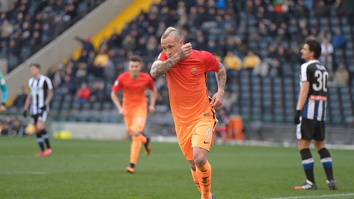 Roma a due facce nella prima frazione di gioco. I giallorossi sono partiti forte, creando in pochi minuti due azioni pericolose mal sfruttate da Dzeko ed El Shaarawy. La disposizione tattica della squadra di Spalletti non ha permesso per venti minuti buoni di far uscire i friulani dalla propria metà campo, con il pressing e la velocità giallorossa che hanno portato al vantaggio iniziale: palla di prima e al bacio di Strootman che dalla trequarti ha servito con un pallonetto Nainggolan in area di rigore che al volo, girando in diagonale, ha messo in porta per l’1 a 0 dei suoi.