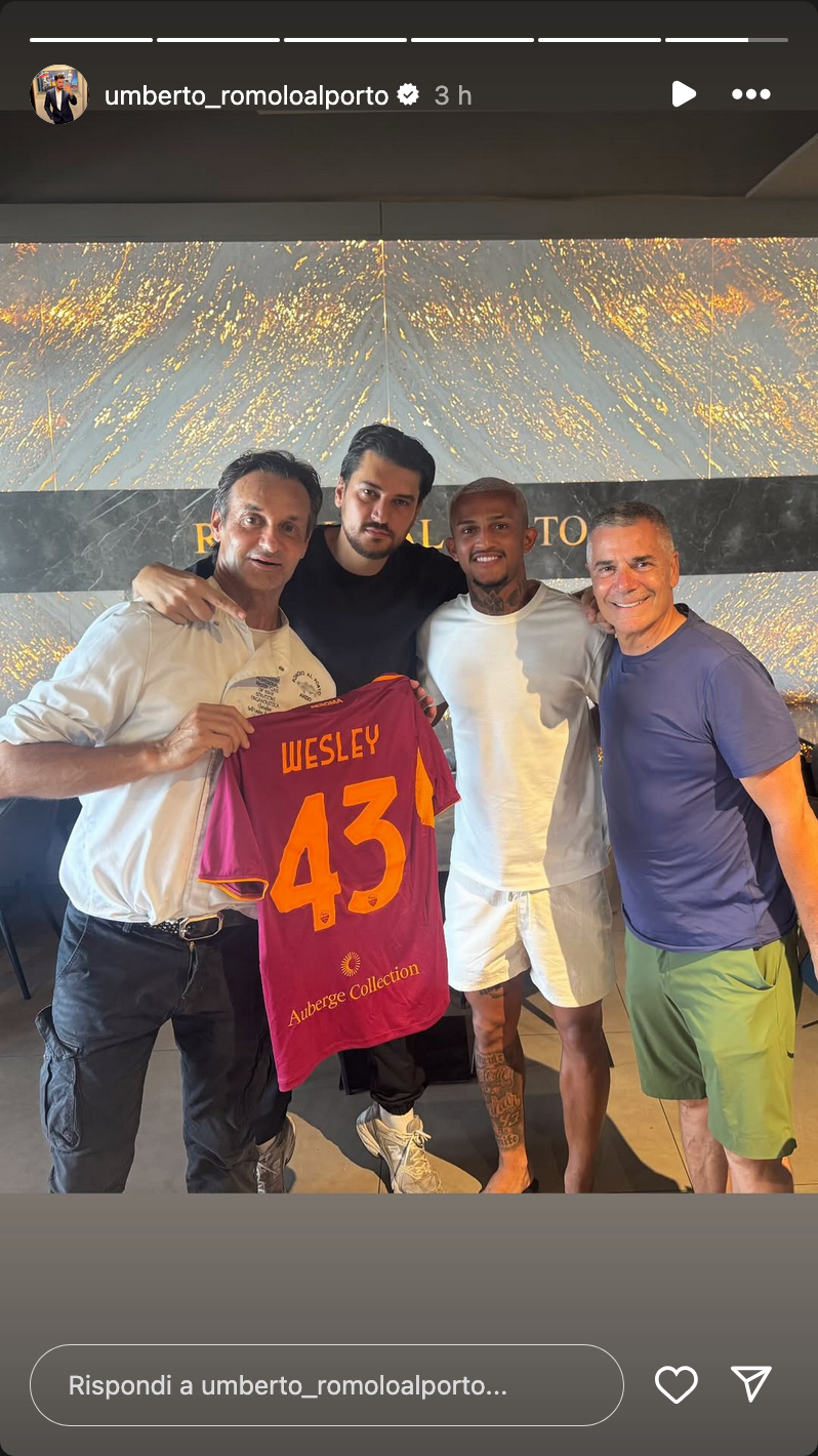 Sembra essersi già cominciato ad ambientare Wesley, classe 2003 arrivato da una quindicina di giorni nella capitale sommerso dall'affetto dei suoi nuovi tifosi e dall'enorme desiderio di vestire giallorosso che lo ha animato nel corso dell'estate. Oltre ai primi minuti in campo, l'ex Flamengo sta conoscendo anche alcuni dei posti più iconici della capitale. Oggi ha fatto tappa ad Anzio, più precisamente nello storico ristorante di Romolo al Porto. Occasione buona anche per scattare una foto celebrativa con i proprietari, con tanto di maglia della Roma.