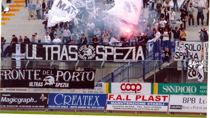 I 2000 tifosi dello Spezia assiepati in un settore della Curva Nord dello stadio Olimpico sono al settimo cielo per la vittoria ai rigori della squadra di Mimmo Di Carlo contro la Roma, che vale i quarti di finale di Tim Cup