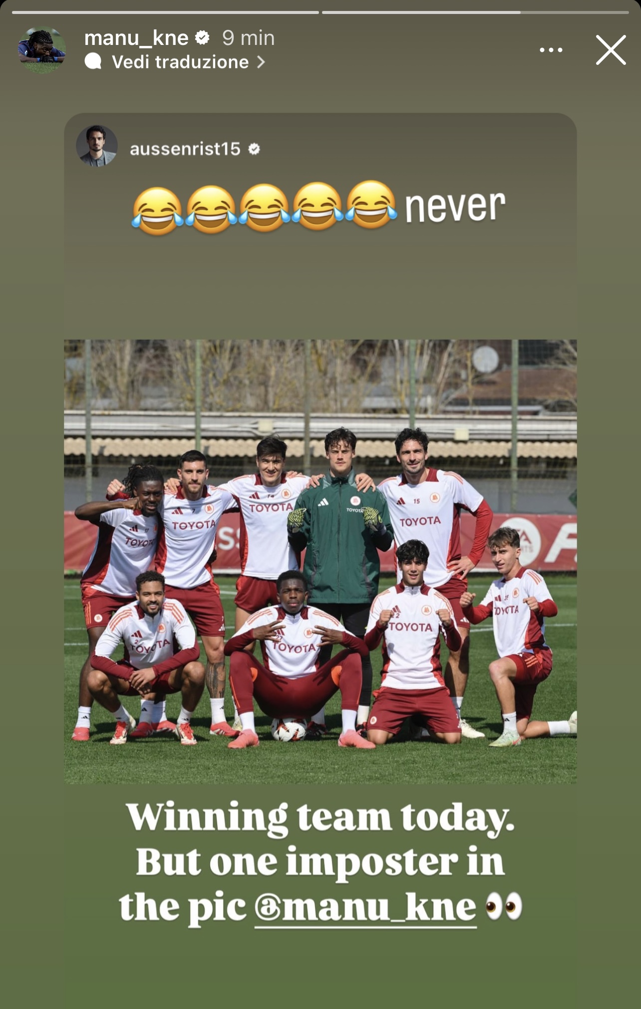 La Roma ha ripreso a faticare oggi dopo la vittoria contro il Como e il riposo concesso da Ranieri nella giornata di ieri. A meno due giorni dall'andata dell'ottavo di Europa League contro l'Athletic, i giallorossi che non sono scesi in campo da titolari o che non hanno completato la partita si sono allenati in campo sfidandosi poi anche nella classica partitella finale. A trionfare è stata la squadra comporta da Pellegrini, Gourna-Douath, Hummels, Rensch, Baldanzi, Shomurodov, Svilar e Cama sotto gli occhi di Ndicka, Paredes, Dybala e Angelino che osservavano a bordocampo. I vincitori del match in famiglia hanno poi scattato una foto celebrativa, postata su Istagram da Hummels:"Ecco la squadra vincente, ma c'è un impostore nella foto", scrive il tedesco menzionando Manu Koné. Il francese ha poi repostato facendo finta di niente: "Mai", la risposta dell'ex Gladbach con tanto di risata.