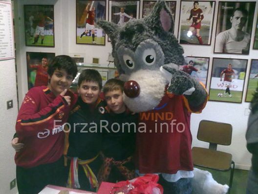Spensierati e felici gli occhi di questi “tifosi in erba” si illuminano alla vista di Romolo: il lupo mascotte della Roma che accoglie la squadra sul terreno dell’Olimpico. Tutti a fare le foto. Quando ricapita un’occasione simile! In molti lo considerano “la Roma”. Una sorta di istituzione nel mondo giallorosso. Dulcis in fundo gadgets per tutti.
