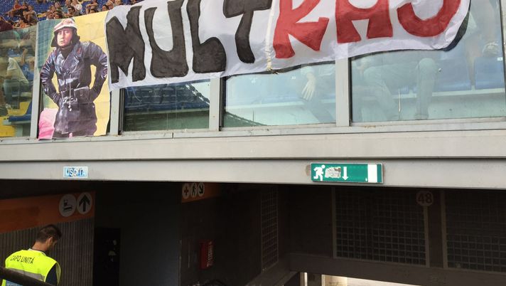 Per ironizzare sull’eccessivo ricorso alle sanzioni nei confronti del pubblico dell’Olimpico, come scrive Gianluca Lengua su Il Messaggero, un tifoso della Curva Nord ha esposto in successione l’immagine di Alberto Sordi nei panni del popolare personaggio e lo striscione con la scritta “Multras”.