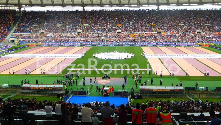 Alla fine del riscaldamento, sono stati stesi sul prato dell’Olimpico dei teli gialli e rossi che hanno riempito completamente il campo di gioco dello stadio, lasciando vuoto solo lo spazio del centrocampo.
